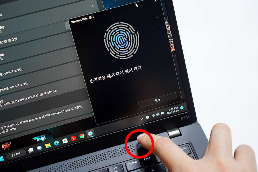 보이시는 것처럼 생체인증이 가능하도록 지문인식 센서를 겸하고 있기에 주로 검지 손가락을 인식시켜서 바로 노트북을 잠금해제 할 수 있습니다.