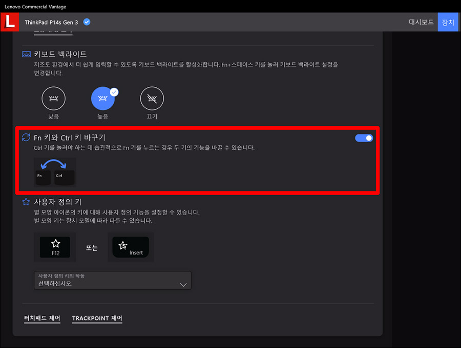 Lenovo Vantage 앱에서 설정을 할 수 있습니다. Fn키와 Ctrl 키 바꾸기를 활성화 할 수 있고, 이렇게 하면 Ctrl키가 가장 바깥키로 설정이 되기 때문에, Fn키와 Ctrl키의 위치가 익숙하지 않으신 분들을 이 기능을 켜서 사용하면 더욱 편하게 사용할 수 있습ㄴ다.