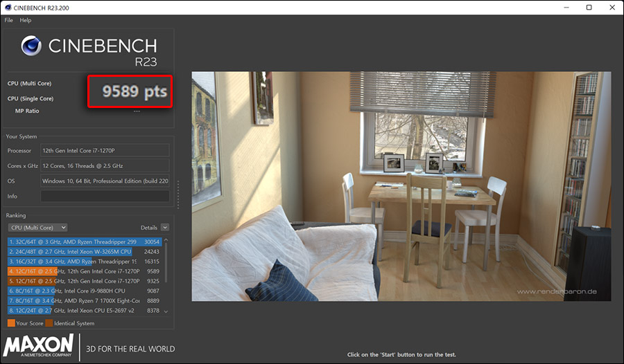 씨네벤치R23은 9589점이 나왔습니다. 휴대성에 집중되어있는 상대적으로 작은 14인치 노트북에서 나오는 성능이라고 생각되지 않을 정도로 높은 점수네요. 업그레이드 모델은 i7-1280P까지 선택할 수 있기에, 더 고성능을 원하는 파워유저라면 CPU를 업그레이드한 모델을 선택해보는 것도 좋겠다는 생각이 듭니다.