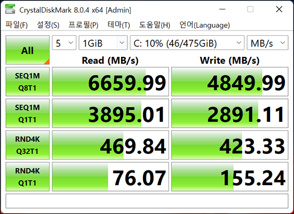 체감 성능에 큰 영향을 끼치는 스토리지 속도 성능은 최대 순차 읽기속도는 6600MB/s 대, 그리고 쓰기속도는 4800MB/s를 유지하고 있습니다.