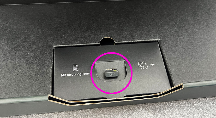 키보드 본체 이외의 주요 구성품을 살펴보면 볼트 수신기가 있습니다. 안쪽에는 USB-C 케이블도 들어있죠. 잠깐 충전용으로만 사용해서 지금은 그냥 박스안에 넣어두고 있습니다.
