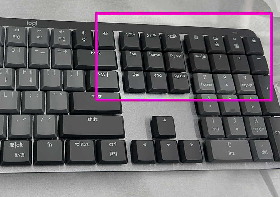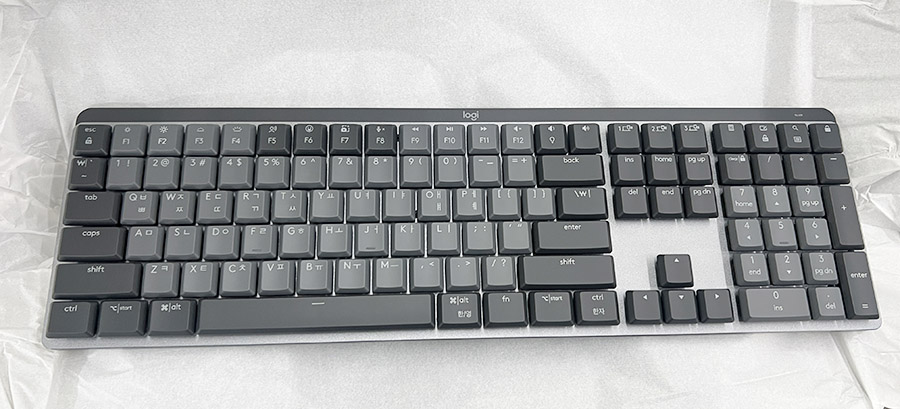 MX Mechanical Mini와 비교를 해보면, 역시 키배열이 가장 먼저 눈에 들어옵니다. 오른쪽에 있는 숫자키패드 이외에도 조금 더 편하게 쓸 수 있는 단축키 구성이 있어서.. 저는 집에서는 넘버키패드가 있는 MX 메카니컬을 사용하고 있죠.