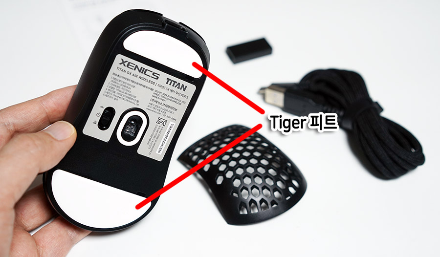 하단 부분을 살펴보면 마우스를 사용할 때 원활하게 움직일 수 있도록 성능이 좋은 타이거 피트가 부착되어 있습니다. 마우스 글라이드를 중요하게 생각하시는 분들은 직접 피트를 교체하는 경우도 많은데요. 고급 피트가 부착되어 있어서 컨트롤에 꽤 도움이 되는편입니다.