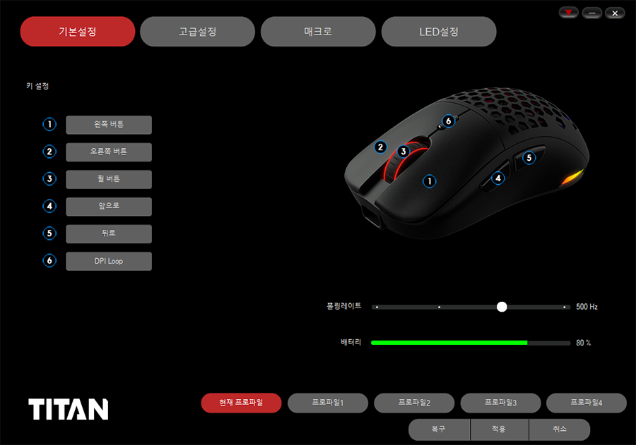 전용 소프트웨어를 사용하면 다양한 마우스 설정과 커스텀을 할 수 있습니다. 가장 먼저 LED설정을 통해 원하는 대로 LED 점등 효과를 수정할 수 있습니다. 색상은 RGB 1680만 컬러를 조합할 수 있고, 프로파일 슬롯도 4개가 있어서 저장해두었다가 쉽게 전환 적용을 할 수 있어서 좋네요.