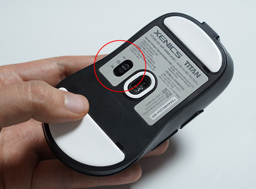 전원 스위치의 경우 위로 올려도 되고, 아래로 내려도 되는 구조입니다. 아래로 내릴 경우 컬러 LED가 점등되도록 되어 있기에 화려한 LED를 키고 싶다면 밑으로 내리면 되고, 배터리를 절약하면서 마우스를 사용하고 싶다면 위쪽으로 올리면 됩니다. ^^