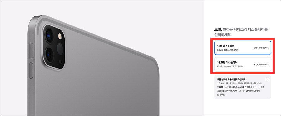 μ λ μμ΄ν¨λ νλ‘ 11μΈμΉλ₯Ό μ ννμ΅λλ€. 128GB κΈ°λ³Έν, Wi-Fi λͺ¨λΈ κΈ°μ€μΌλ‘ 11μΈμΉ λͺ¨λΈμ 117λ§μμ΄κ³ , 12.9μΈμΉ λͺ¨λΈμ 157λ§μλΆν° μμμ νλ€μ.