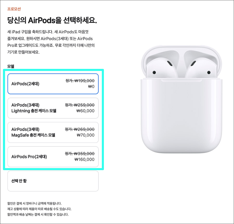 λλμ΄ μμ κ°μ΄ μμ΄ν(AirPods)λ₯Ό μ νν μ μλ νλ©΄μ΄ λΉλλ€. μμ΄ν 2μΈλ λͺ¨λΈμ 0μμΌλ‘ 무λ£λ‘ μ μ²ν μ μκ³ , μμ΄ν 3μΈλλ 6λ§μ μΆκ°, 무μ μΆ©μ μ΄ λλ μμ΄ν3μΈλ λͺ¨λΈμ 7λ§μ, κ·Έλ¦¬κ³ μ μ νμ μνλ μμ΄ν νλ‘ 2μΈλ λͺ¨λΈμ 16λ§μμ μΆκ°νλ©΄ λ©λλ€.