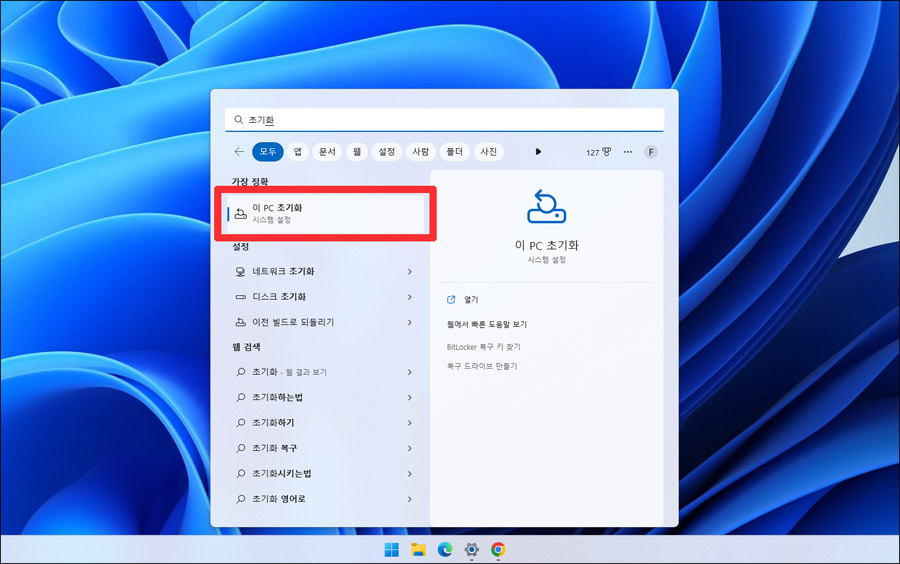 ๊ฐ์ฅ ๋จผ์ ์๋์ฐํค๋ฅผ ๋๋ฅด๊ฑฐ๋ ์์ ๋ฉ๋ด๋ฅผ ํด๋ฆญํ ๋ค์ '์ด๊ธฐํ'๋ผ๊ณ ๊ฒ์์ ํฉ๋๋ค. ๊ทธ๋ฌ๋ฉด ์ด PC ์ด๊ธฐํ ๋ฉ๋ด๊ฐ ๋์ค๋๋ฐ์. ์ด๊ฑธ ํด๋ฆญํฉ๋๋ค.