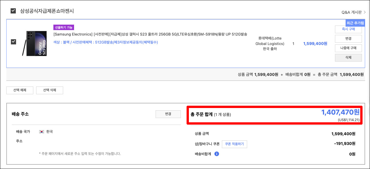 위에서 보이시는 것처럼, 최종 결제 금액은 140만 7470원이 됩니다. :)