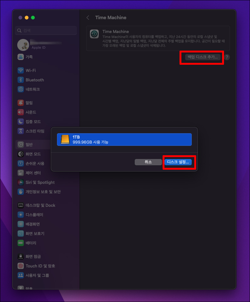 ์์ ๊ฐ์ด ํ์๋จธ์ ๋ฐฑ์ ์ ์ค์ ํ๋ฉด์ '๋์คํฌ ์ค์ '์ ํ๊ฒ ๋ฉ๋๋ค.