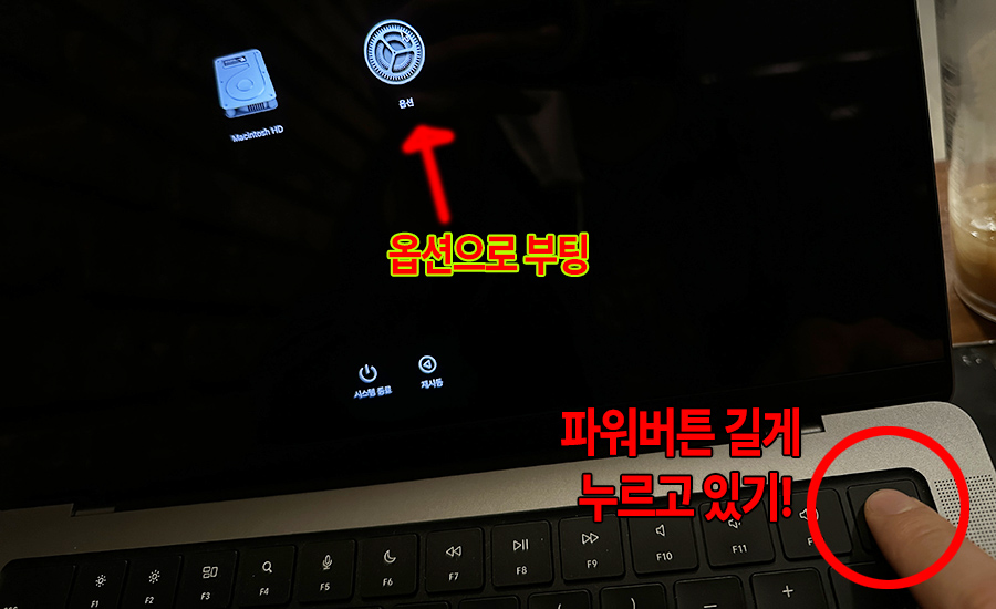 ๋๋ ๋ง์ฝ ์์คํ ์ ์ฒด๋ฅผ ํ์๋จธ์ ๋ฐฑ์ ์ ํด๋ ์ํ์ ๊ทธ๋๋ก ๋ณต์ํ๊ณ ์ถ๋ค๋ฉด ๋งฅ๋ถ ๋ ธํธ๋ถ์ ์์คํ ์ ํฌ ๋ ํ์๋ฒํผ์ ๊ธธ๊ฒ ๋๋ฅด๊ณ ๋ถํ ํ์ฌ ์๋์ ๊ฐ์ด ์ต์ ์ผ๋ก ๋ถํ ์ ํฉ๋๋ค. (๋ง์ฝ ์ค๋๋ ์ธํ ๋งฅ๋ถ์ ์ฌ์ฉํ์ ๋ค๋ฉด ๋ถํ ํ ๋ optionํค๋ฅผ ๋๋ฅด๋ฉด์ ๋ถํ ํ๋ฉด ์ต์ ์ด ๋น๋๋ค)