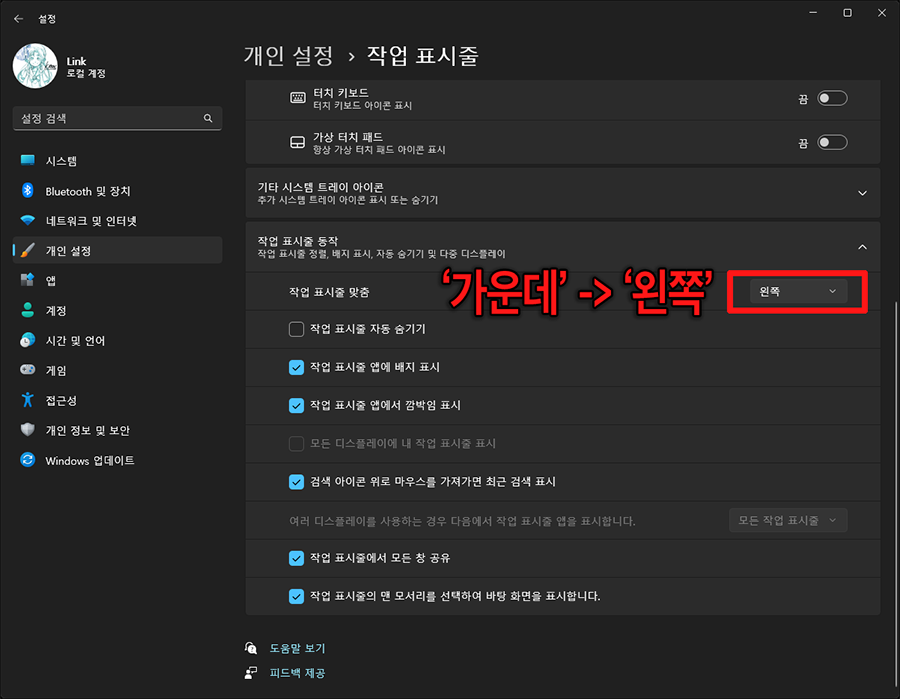 μ΄μ΄μ ν΄λΉ νλ©΄ (μ€μ -> κ°μΈ μ€μ -> μμ νμμ€)μμ κ·Έλλ‘ μ€ν¬λ‘€μ μ‘°κΈ λ΄λ¦¬λ€ 보면, μμ νμμ€ λμ νλͺ©μ 'μμ νμμ€ λ§μΆ€' νλͺ©μμ κΈ°λ³Έ μ€μ μΌλ‘ λμ΄ μλ 'κ°μ΄λ°' λμ 'μΌμͺ½'μΌλ‘ μ΅μ μ μ§μ ν΄μ€ μ μμ΅λλ€. κ·Έλ¬λ©΄ κ³Όκ±° μλμ°95~μλμ°10κΉμ§ μ΄μ΄μ Έ μ€λ μ ν΅μ λ°λΌ μλμ° μμ λ²νΌμ μΌμͺ½μΌλ‘ λ€μ μμΉμν¬ μ μμ£ .