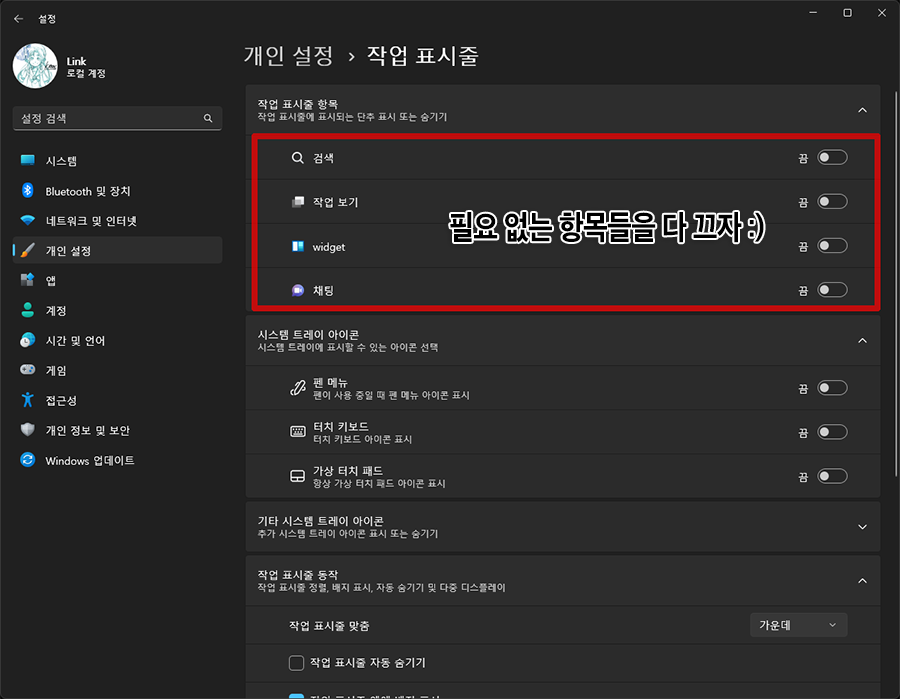 λμ€λ νλ©΄μμ κ°μ₯ μμͺ½μ μλ μμ νμμ€ νλͺ©μ 'κ²μ, μμ 보기, Widget, μ±ν ' νλͺ©λ€μ λͺ¨λ 'λ'μΌλ‘ λ³κ²½ν©λλ€. λ§μ½ μ νμ©νλ κ°λ³ κΈ°λ₯μ΄ μλ€λ©΄, ν΄λΉ κΈ°λ₯λ§ μΌλκ³ λ€λ₯Έ νλͺ©λ€μ λλ©΄ μμ λ©λ΄λ°λ₯Ό λ κΉλνκ² μ¬μ©ν μ μμ΅λλ€. (μ΄ κΈμ μ°λ λμ μλμ°11μ΄ λ νλ² μ λ°μ΄νΈκ° λμλμ§, 'κ²μ'μ°½μ μ΄μ λ€λ₯Έ μ΅μ λ€λ κ°μ§κ³ μμ΄μ 'μ¨κΉ'μΌλ‘ μ€μ ν΄μΌ κ² λ€μ ^^)