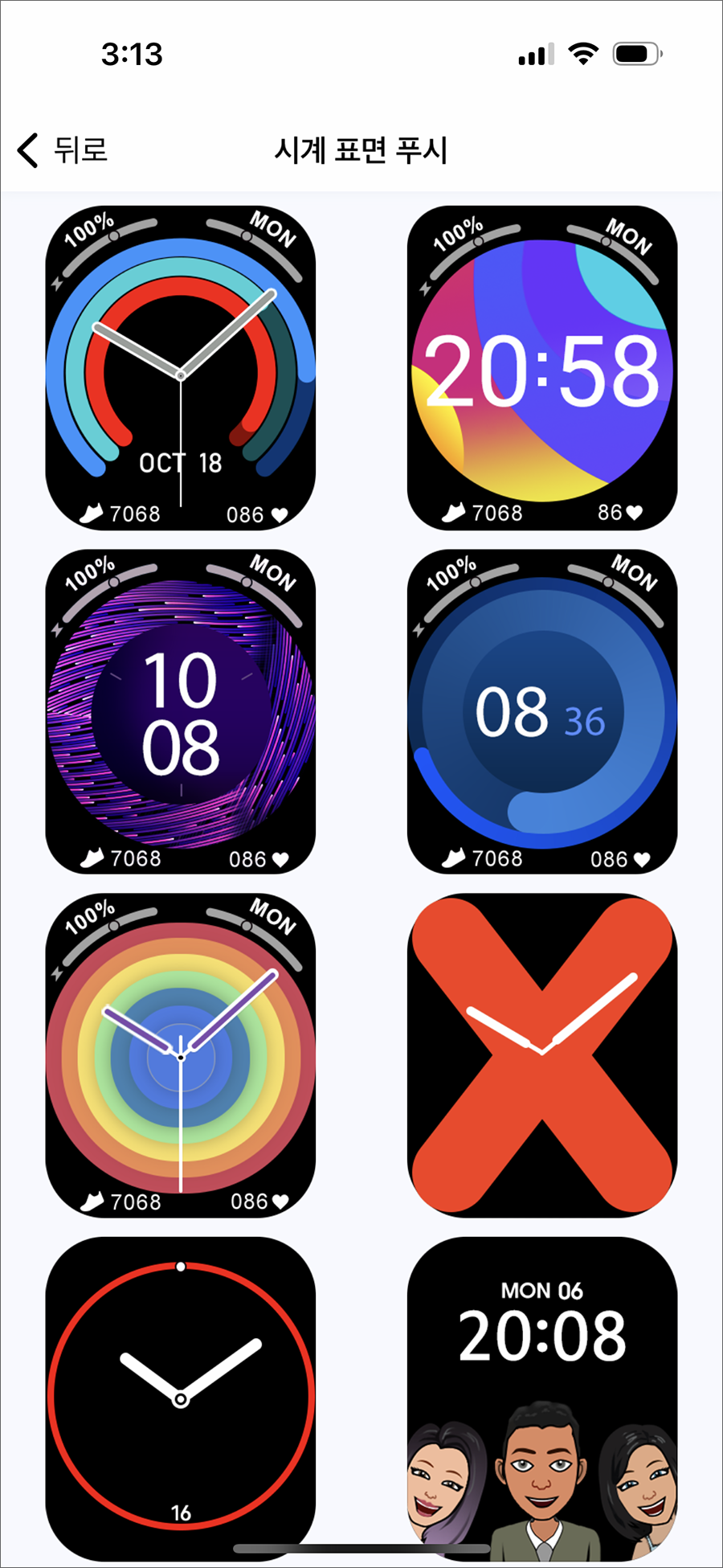 다이얼을 돌리면 기본 워치페이스들이 꽤 화려한 것이 많습니다. ㅎㅎ 전용 앱을 통해 워치페이스를 다운로드 받을 수도 있는 것 같네요.