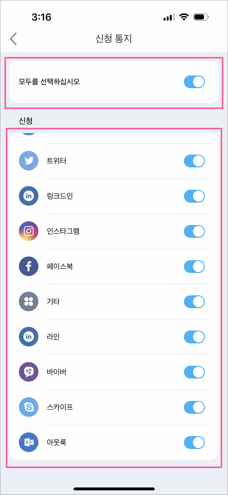 사실 모든 푸시 알림을 다 받고 싶지 않는 경우가 있어서 잘 사용하는 SNS나 메신저 앱만 따로 켜두는 것을 좋아하는데... 라인이나 Whatsapp 등 해외에서 통용되는 메신저 서비스들은 목록에 잘 보이는데... 한국의 카카오톡은 리스트에서 안보이네요 ㅎㅎ