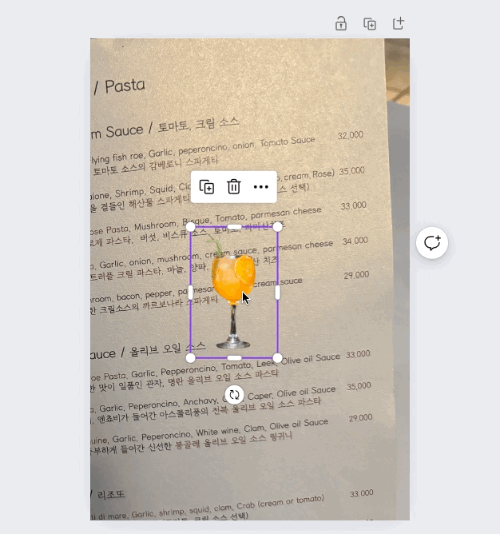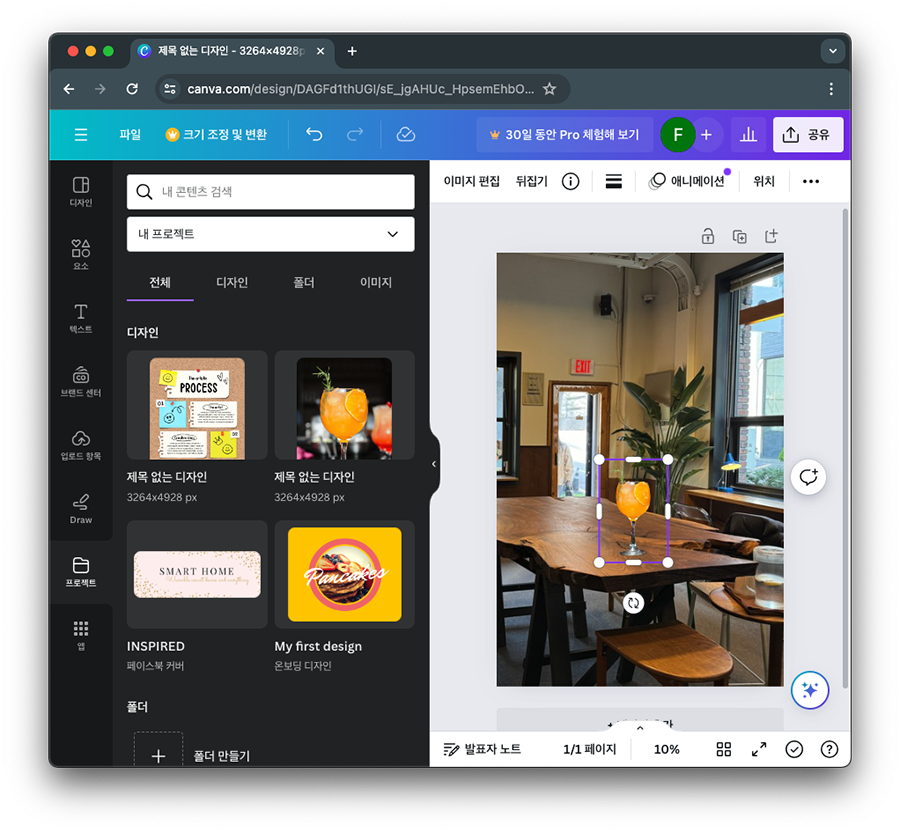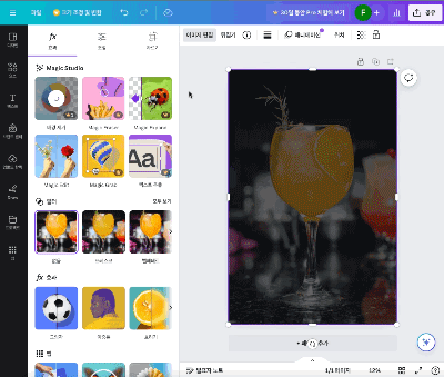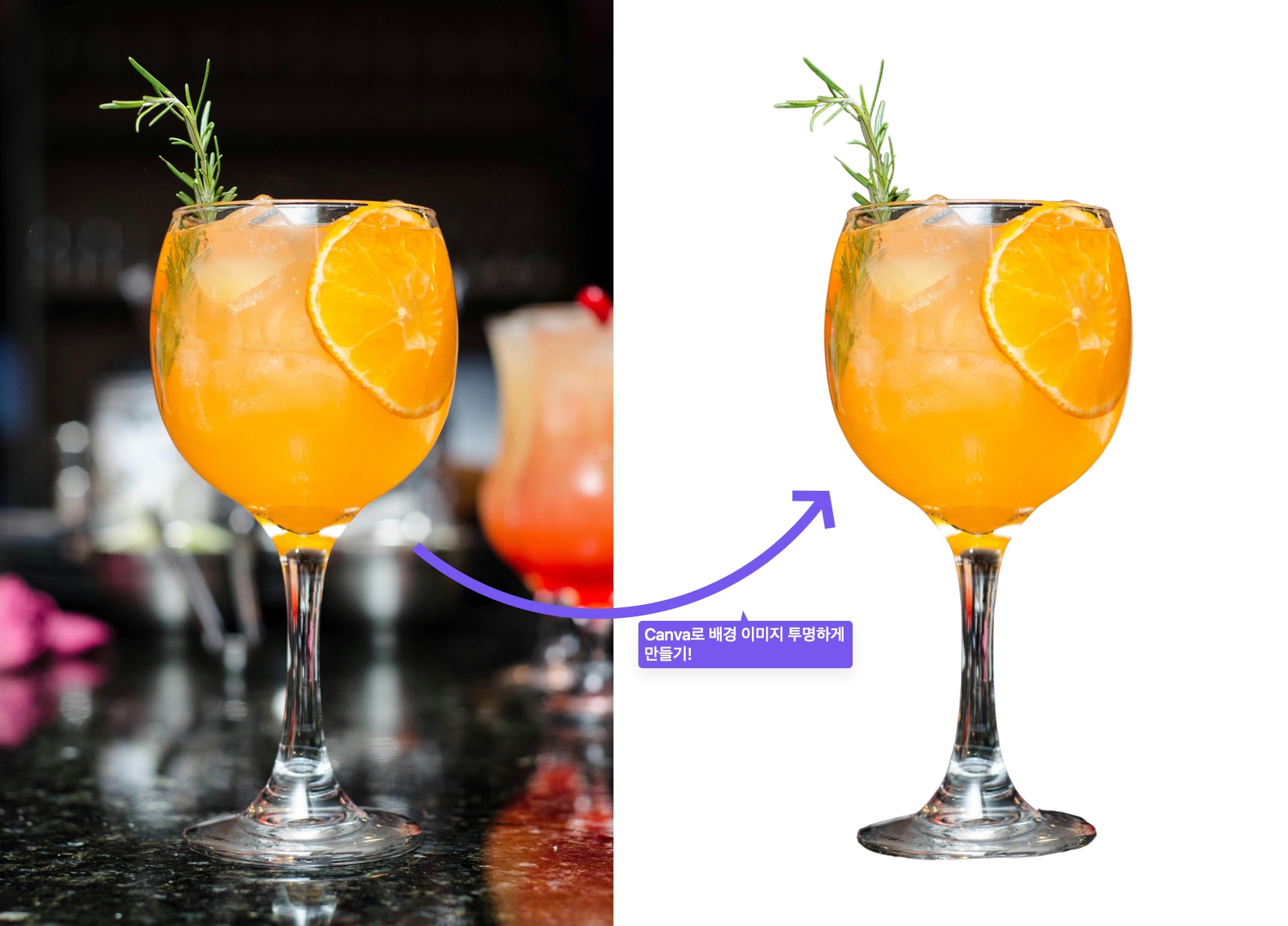 이렇게 배경이 깔끔하게 제거된 이미지를 가지고 캔바 안에서 원하는 그래픽 편집을 하면 됩니다. 그래픽 문서에 배경을 제거한 이미지를 올리거나, 직접 촬영한 사진에 배경을 투명하게 만든 이미지 오브젝트를 Canva로 쉽게 편집하여 만들 수 있습니다.