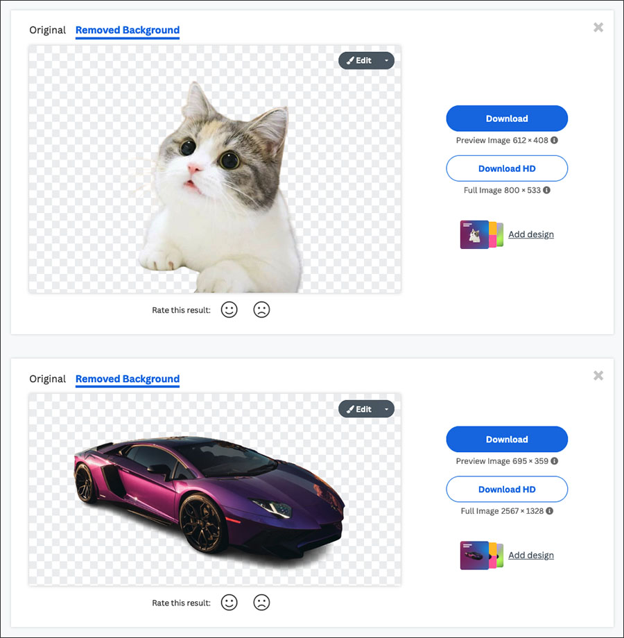 캔바 (Canva)에도 이미지의 배경을 투명하게 만들어주는 기능을 제공하기에 사용해보았습니다. 그래픽 편집 작업을 캔바에서 하는 경우, 캔바의 배경 제거 기능을 통해 손쉽게 원하는 이미지를 만들어 낼 수 있죠. 아래와 같이 배경이 복잡한 피사체도 클릭 한번으로 깔끔하게 배경을 투명하게 만들어줍니다.