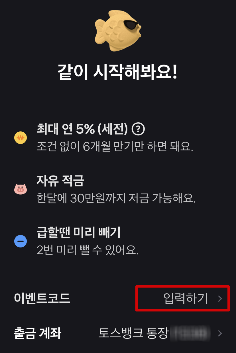 토스뱅크 굴비 적금 이벤트코드: 냉동물개0363