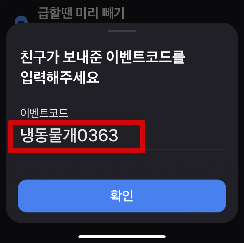 '냉동물개0363'을 입력하시면 됩니다. 제 경우에는... 가족들을 초청하면서 이벤트코드를 넣어봤는데 대략...