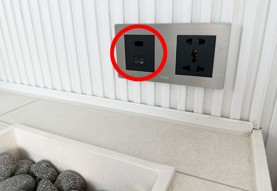 침대 근처에 있는 벽면에도 HDMI 케이블과 USB 포트를 넣을 수 있도록 설계되어 있던 것 같은데... 직접 여기에 포트를 연결해보진 않아서 실제로 동작을 하는 것인지는 모르겠네요. USB 포트의 경우 구멍만 있고 안에 단자가 없는 것을 보아, 처음에는 침대 머리맡에 HDMI 케이블을 연결하여 TV연결을 쉽게 하려고 했던 것 같은데, 뭔가 개조가 되었거나 달라진 것 같네요 ㅎㅎ