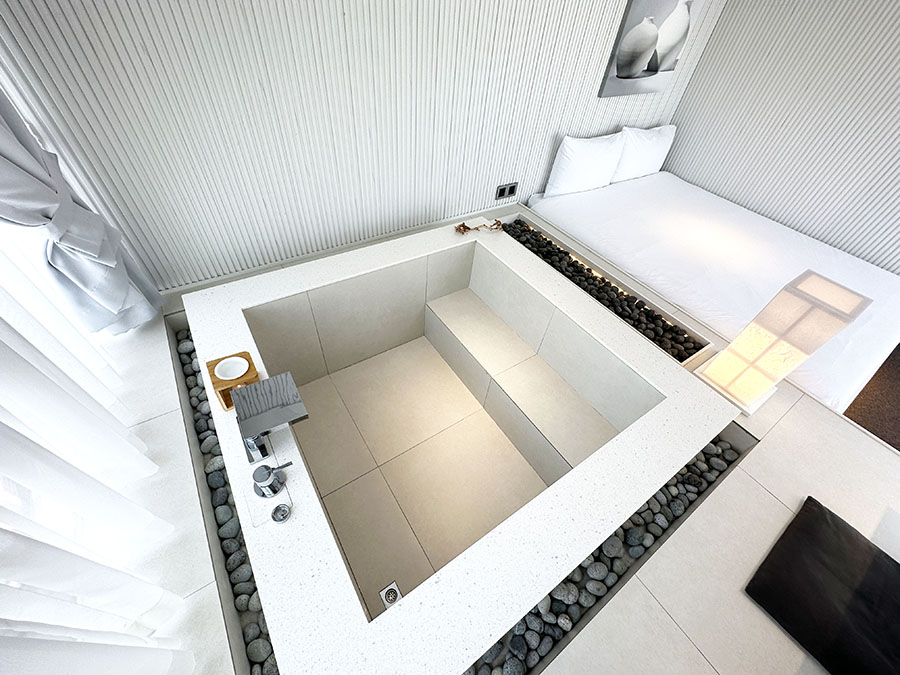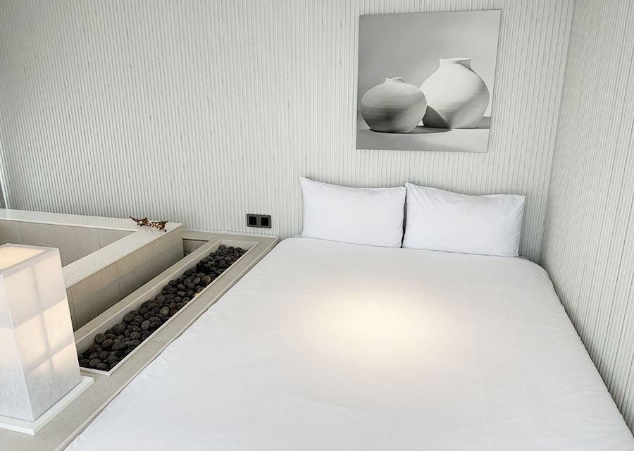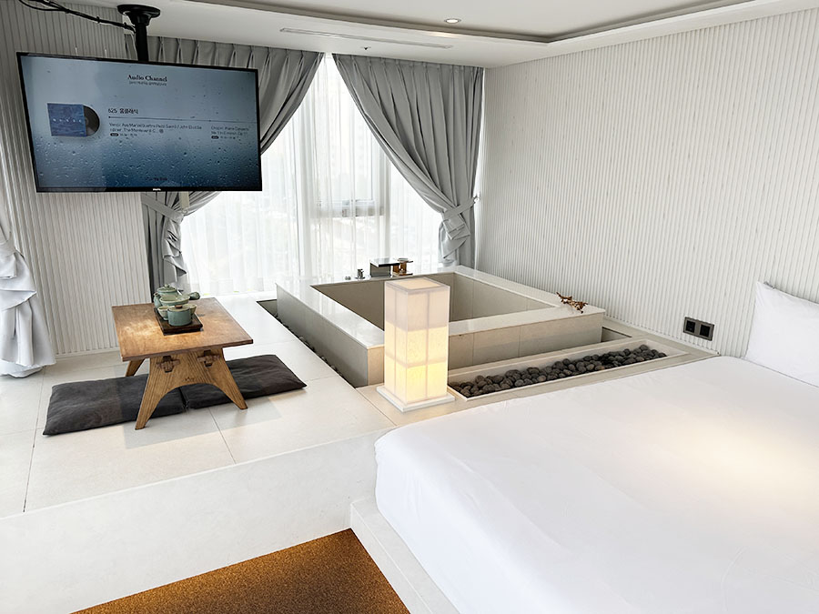 그리고 넓은 침대 입니다. 옆에는 더 리프 사당 호텔의 하이라이트라고 할 수 있는 반신욕 욕조가 있는 것이 특징이죠. 이건 아래에서 다시 한번 자세히 살펴보겠습니다.