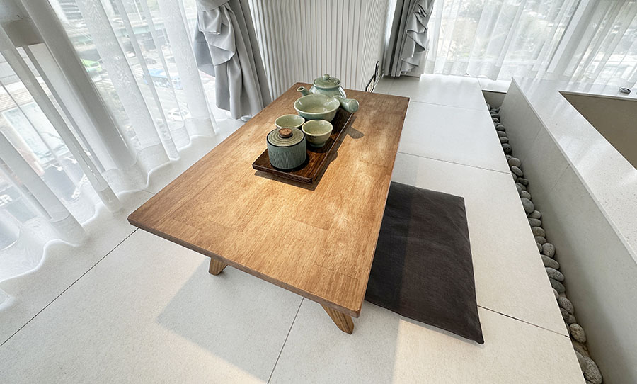 티타임을 즐길 수 있도록 되어 있는 좌식 테이블 (녹차잎이 들어 있더군요. 저는 녹차를 마시지 않아서 사용하지는 않았습니다. ㅎㅎ)