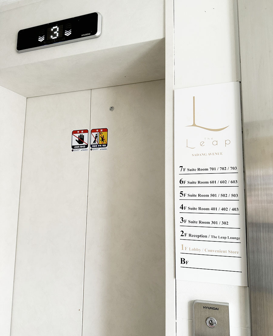 호텔이지만 특이하게도 들어가는 입구는 생활형 숙박시설처럼 되어 있습니다. 주위에 자주 보이는 오피스텔 같은 건물이라고 생각하시면 될 것 같네요. 공용문이 있어서 미리 체크인 전에 이메일이나 호텔로부터 받은 공용문 비번을 누르고 들어가야 합니다. 호텔이 주는 멋진 프론트나 첫인상이 없다는 것이 더리프사당 부티크 호텔의 가장 큰 단점이라고 할 수 있습니다. ㅎㅎ (그리고 도어락이 붙어 있는 문은 고정문이고 옆에 문을 열어야 하기에 처음 오면 조금 헷갈리기도 합니다)