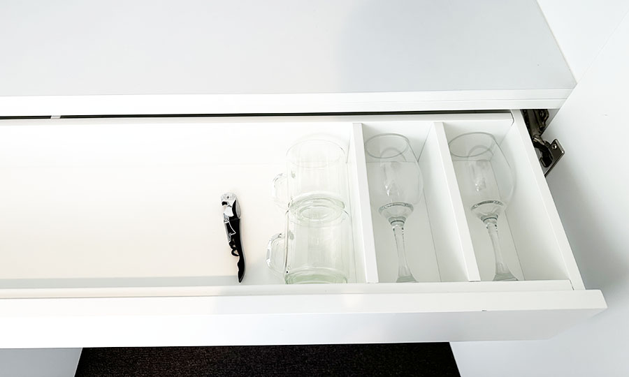 옷장 안에는 와인글래스와 컵, 그리고 와인 오프너가 있고, 에어콘과 TV리모콘들이 있습니다.