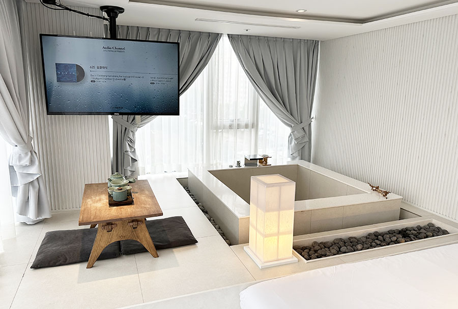 침대 바로 옆에 자쿠지 스타일의 스파 욕탕이라... 꽤 로맨틱한 분위기를 연출할 수 있어 좋았습니다.