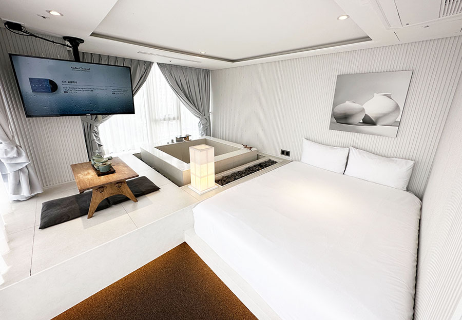 그리고 넓은 침대 입니다. 옆에는 더 리프 사당 호텔의 하이라이트라고 할 수 있는 반신욕 욕조가 있는 것이 특징이죠. 이건 아래에서 다시 한번 자세히 살펴보겠습니다.