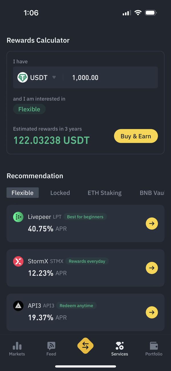 바이낸스는 아쉽게도 아직 한국어를 지원하고 있지는 않아서 사용하는 것이 살짝 불편해보이긴 하지만, 2~3일 정도 사용해보니 슬슬 익숙해지더군요. USDT(Tether)와 같은 USD달러와 같은 가치를 가진 기축통화를 활용할 수도 있고, 정확한 표현인지는 모르지만 Binance Earn이라는 스테이킹과 비슷한 개념으로 코인 이자를 받을 수 있는 기능도 있는 듯 합니다. 보상(Earn)이 높고 언제든 뺄 수 있는 (Flaxible Redeem) 알트코인으로 전환해서 잠깐 코인 이자를 리워드로 받는 재테크고 가능해보입니다. ㅎㅎ