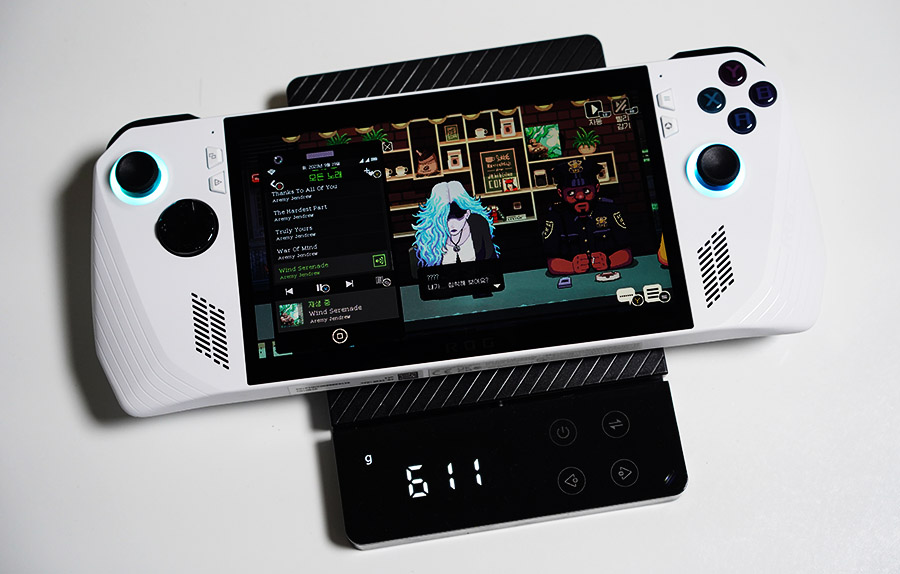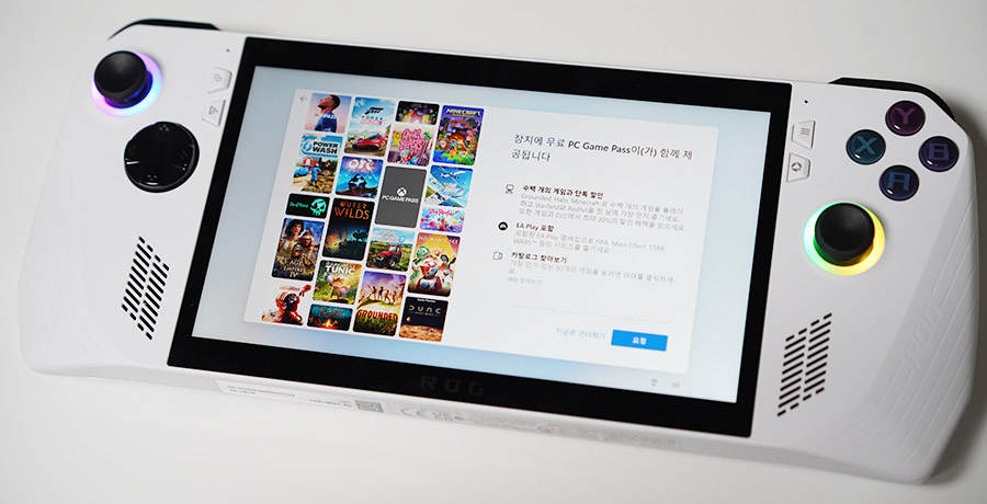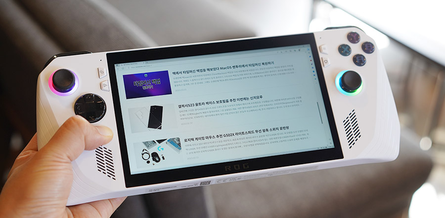 보이시는 것처럼 양쪽에 콘트롤러가 있는, 얼핏보면 닌텐도 스위치를 연상시키지만 실제로는 윈도우OS 운영체제가 돌아가는 컴퓨터 입니다. 그리고 Xbox 컨트롤러 방식의 조작과, 터치스크린도 쓸 수 있어서... 사실상 들고다니는 고성능PC라고 할 수 있죠.