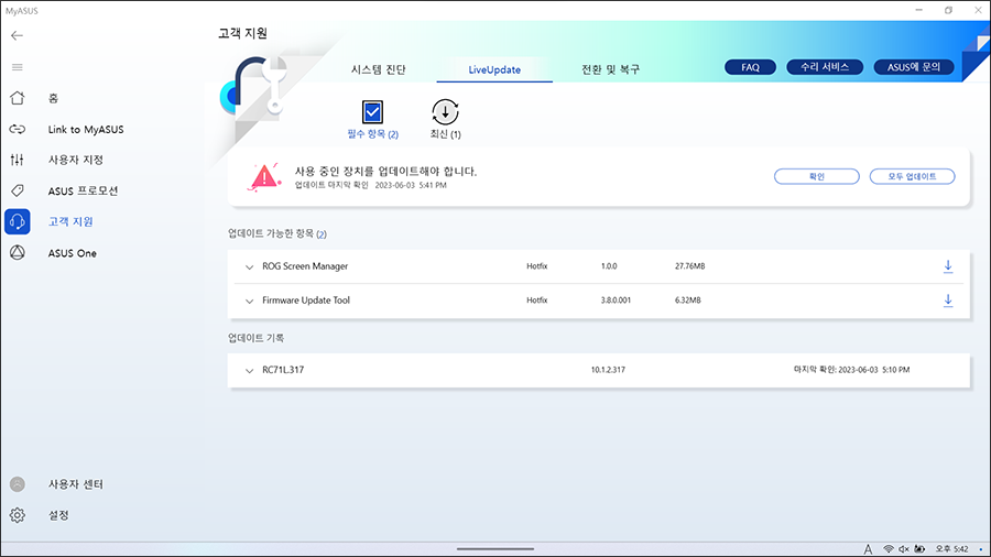 위와 같이 관련 드라이버나 펌웨어 업글 등의 관리를 할 수 있죠.