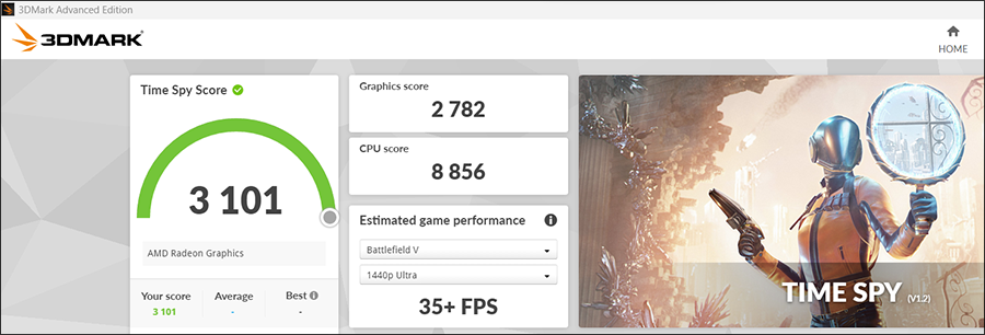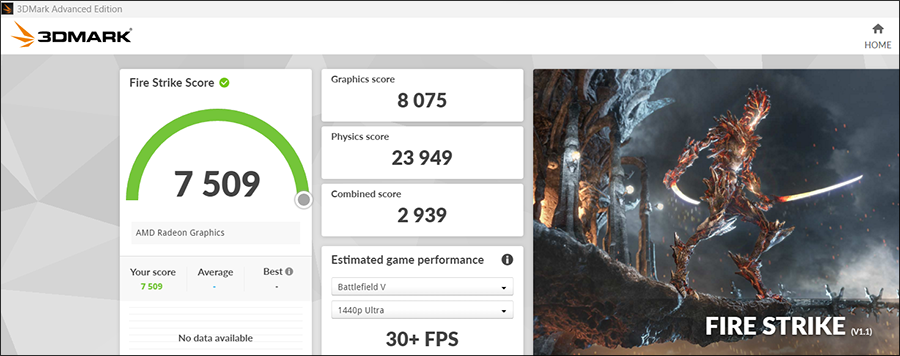 게이밍 UMPC인 만큼 3D 그래픽 성능부터 측정을 해보면... 파이어스트라이크는 7500점을 넘기고..