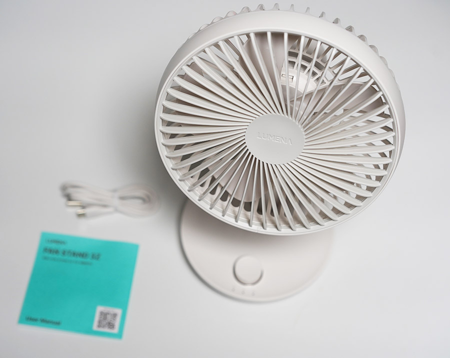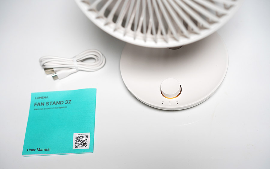 구성품은 메뉴얼, USB C 충전 케이블, 그리고 루메나 탁상용 선풍기 3Z 본체 입니다.
