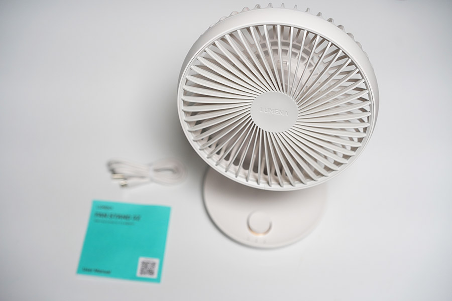 구성품은 메뉴얼, USB C 충전 케이블, 그리고 루메나 탁상용 선풍기 3Z 본체 입니다.