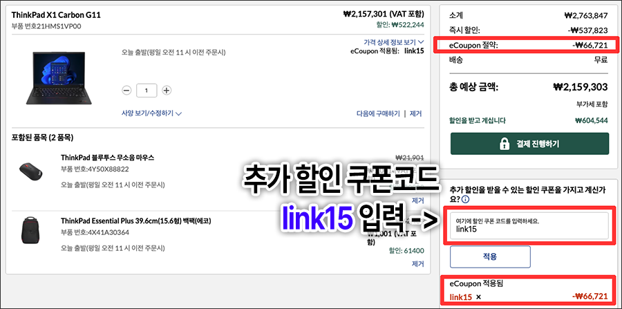 쿠폰코드를 입력하게 되면 추가로 할인이 되기에, 공홈에서는 최저가로 구입을 하실 수 있게 됩니다. 쿠폰코드를 link15입력하고 '적용' 버튼을 누르면, eCoupon이 적용되면서 기본 할인에 추가 할인이 적용되는 것을 알 수 있습니다. 이렇게 하시면 꽤 많이 할인된 가격에 레노버 싱크패드 노트북을 구입을 할 수 있죠. 레노버 공홈에서 씽크패드 노트북을 구입하실 쿠폰코드 적용을 꼭 잊지 마시기 바랍니다. :)