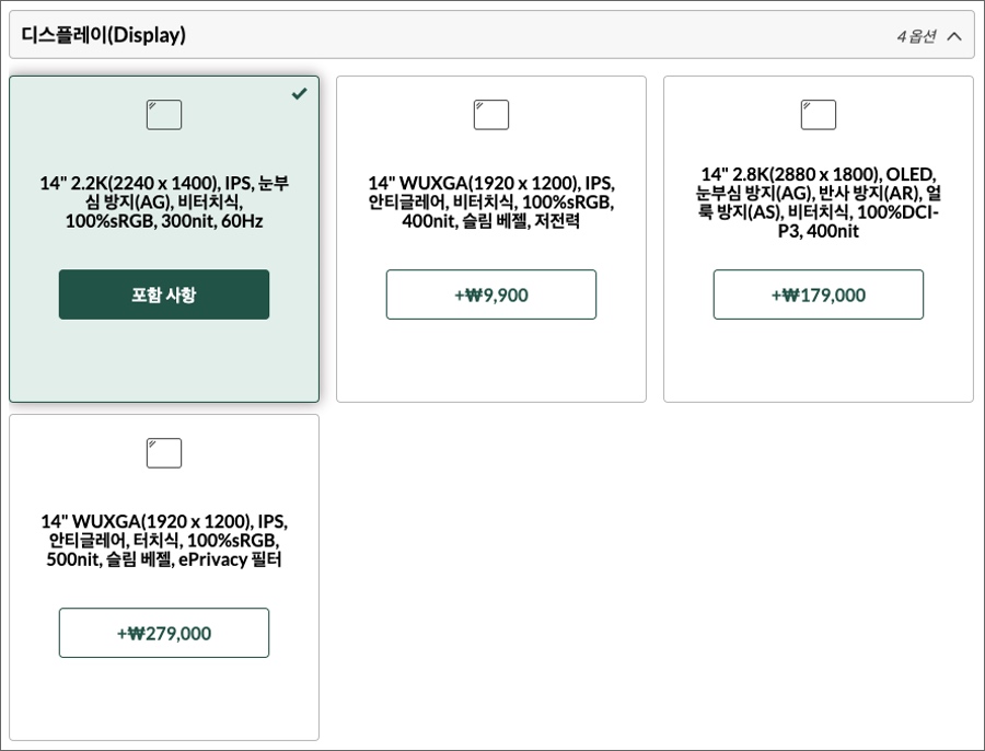 그 다음에는 디스플레이 입니다. 제 경우에는 2240x1400 IPS 300nit 기본 설정 디스플레이를 추천합니다. 그래픽 작업을 많이 하는 디자이너라면 더 높은 해상도를 가진 2880x1800 OLED 모델로 업그레이드를 하시면 좋겠고... 보안쪽이나 금융쪽에 종사하기 때문에 보안기능이 중요하다면 ePrivacy필터가 있는 모델을 선택하시면 좋을 것 같네요. 참고로 ePrivacy 패널은 소프트웨어로 좌우 옆에서 내 스크린이 안 보이도록 해주는 디스플레이를 활성화 할 수 있는 스크린 입니다.