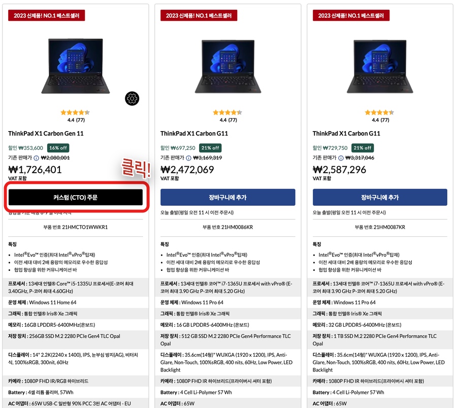 먼저 씽크패드 X1 카본 11세대 모델을 구입하기 위해 위에 사이트로 이동을 해보면, 주문제작(CTO) 커스텀 구입 모델을 아래와 같이 선택할 수 있습니다.