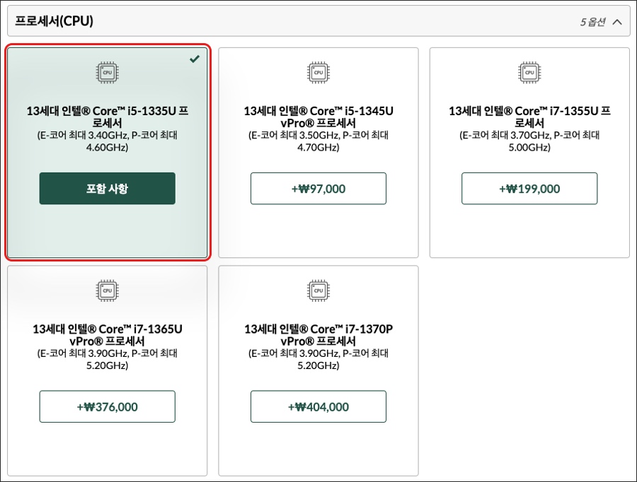 일단 저는 노트북의 경우 전성비와 가성비 측면에서 i7보다는 i5가 좋다고 생각합니다. 여기서는 기본탑재 모델인 인텔 13세대 i5-1335U 프로세서를 선택하고... (만약 더 높은 성능을 원하신다면 i7 모델을 선택하세요)