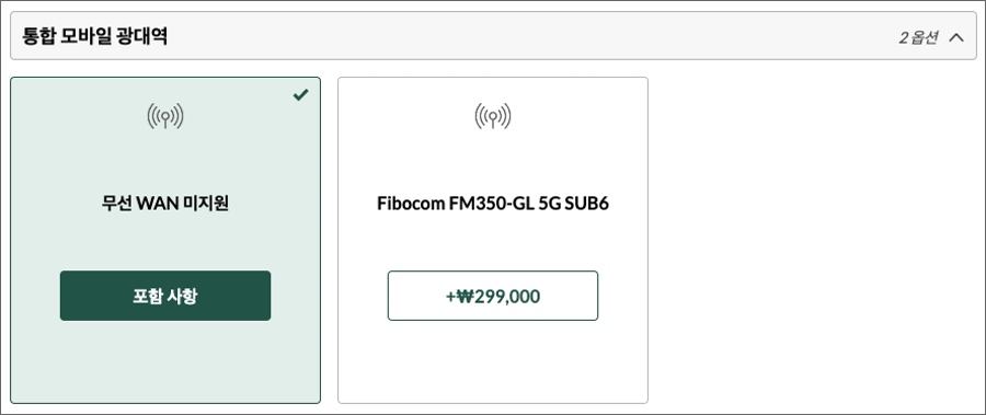 자 이제 eSIM 또는 USIM을 넣어서 노트북의 셀룰러 데이터를 쓸 수 있는 모델을 선택할지 아닐지를 선택하게 됩니다. 국내에서는 어디든 와이파이가 있지만, 아직 해외 곳곳에서는 와이파이가 잘 안되는 곳도 있고, 비즈니스 업무를 해야 할 때는 와이파이 무선 인터넷이 없는 공간에서 셀룰러 망으로 업무를 봐야 한다면, '통합 모바일 광대역' 항목에 있는 Fibocom FM350-GL 5G SUB6 모델을 선택하면 유심칩을 넣을 수 있는 노트북으로 구입할 수 있죠.