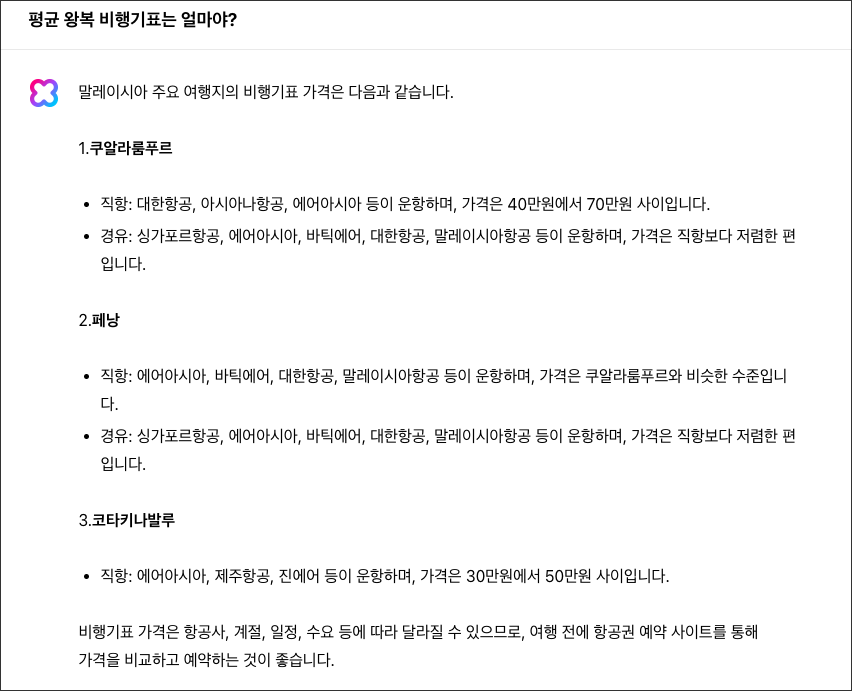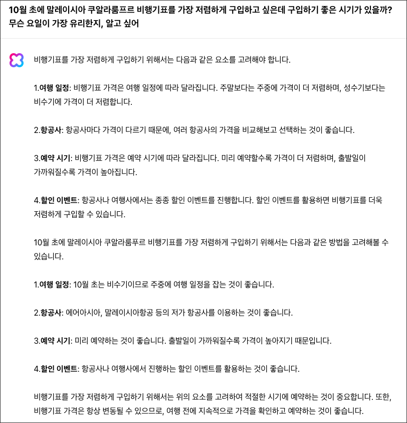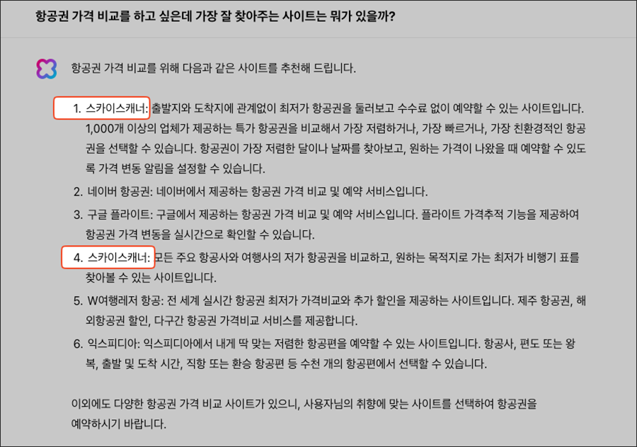 ์ฌํ๊ณผ ๊ด๋ จ๋ ์ง๋ฌธ์ ํ๋ค๋ณด๋, ๊ทธ๋์ ํญ๊ณต๊ถ์ ์ด๋์ ๊ตฌ์ ํ๋ฉด ์ข์๊น?๋ผ๊ณ ํ๋, ์ค์นด์ด์ค์บ๋๋ฅผ 2๋ฒ ๋ฐ๋ณตํด์ ๋งํด์ฃผ๋ ๊ฒ์ ๋ณด๋ฉด... ์ค์นด์ด์ค์บ๋๊ฐ ์์ฒญ ์ข๊ฑฐ๋ ๋ค์ด๋ฒ ํด๋ก๋ฐX AI ์ญ์ ์๋ฒฝํ์ง๋ ์์๋ฏ ํฉ๋๋ค.