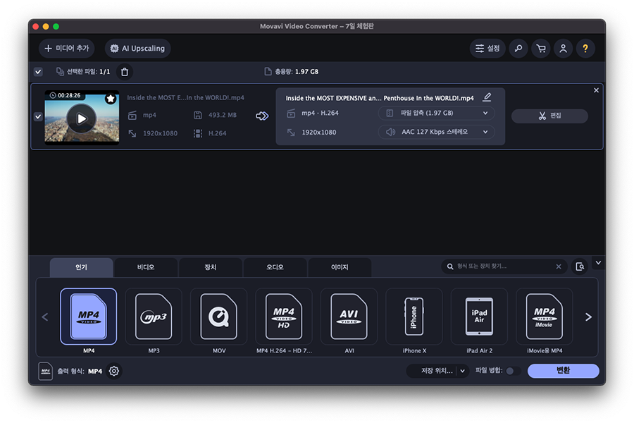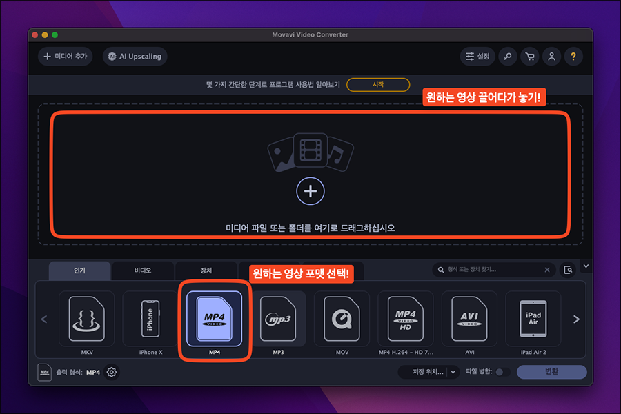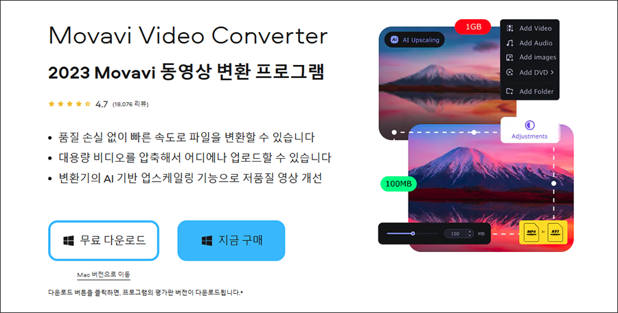 ๊ฐ์ฅ ๋จผ์ ์ถ์ฒํ๋ ๋์์ ๋ณํ ์ํํธ์จ์ด๋ Movavi Video Converter 2023์ ๋๋ค. MP4 ์์ ๋ฟ๋ง ์๋๋ผ MKV, WEBM ๋ฑ ๋์์ ํฌ๋งท์ ๋ณํํ๊ฑฐ๋ ๋น ๋ฅด๊ฒ ์์ถํด์ผ ํ ๋ ์์ ๋ถํฐ ์ ์ฉํ๊ณ ์๋ ์ํํธ์จ์ด์ธ๋ฐ์.