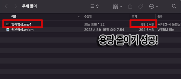 ์์ ๊ฐ์ด ์ ๊ฐ ์ค์ ํ ๋๋ก MP4 ํ์ผ ์์์ผ๋ก ์ฉ๋์ด ํฌ๊ฒ ์ค์ด๋ ๊ฒ์ ์ ์ ์์ต๋๋ค. ํด์๋๋ ๋ฎ์ถ๋ ์๋ ์ฌ์ด์ฆ๋ณด๋ค 1/8 ์ ๋ ์ฉ๋์ ์ ์ฝํ ์ ์์๋ค์. ํ์ง๋ ๊ณต์ ์ฉ์ผ๋ก๋ ๋ฑ ์ข๊ฒ ์์ ํ์ผ์ ์์ถํ ์ ์์์ต๋๋ค.