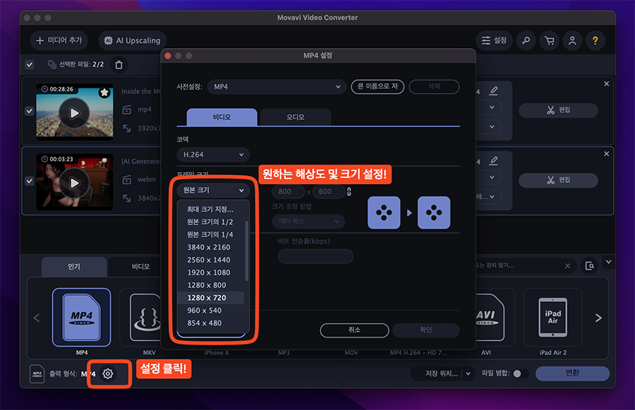 ๋ํ ํด์๋๋ฅผ ์กฐ์ ํ์ฌ ํฌ๊ธฐ๋ฅผ ์ค์ด๊ณ ์ถ๋ค๋ฉด, ํ๋จ์ ์๋ ์ถ๋ ฅ ํ์ ์์ ์๋ ํฑ๋๋ฐํด ์ค์ ์์ด์ฝ์ ๋๋ฌ์ ์์์ ํ๋ ์ ํฌ๊ธฐ๋ฅผ ์ํ๋ ํด์๋๋ก ์กฐ์ ํ๋ฉด ๋ฉ๋๋ค. ์ ๊ฒฝ์ฐ์๋ 1280x720์ ์ ํํด๋ณด์์ต๋๋ค.