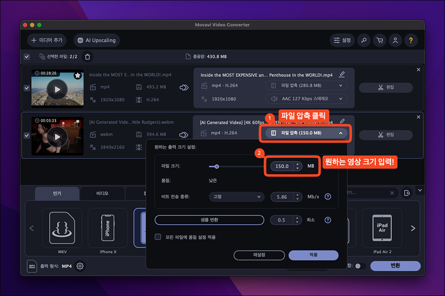 ์ฌ๊ธฐ์ ๊ฐ ์์ ํ์ผ ๋ฆฌ์คํธ์์ 'ํ์ผ ์์ถ' ๋ฐ์ค๋ฅผ ๋๋ฅด๋ฉด ์ ์ฐฝ์ด ๋จ๊ณ , ์ํ๋ ์ถ๋ ฅ ํฌ๊ธฐ ์ค์ ์ต์ ์ ์ค์ ํ ์ ์๋๋ฐ์. Movavi Video Conveter๋ ์ง์ ์ฉ๋์ MB ํฌ๊ธฐ๋ก ์ ๋ ฅํ ์ ์๊ณ , ๊ทธ ํฌ๊ธฐ์ ๋ง์ถ ์์ถ์จ์ด ์ค์ ๋์ด ์ถ๋ ฅ๋๋ค๋ ๊ฒ์ด ๋งค์ฐ ์ข๋ค์.