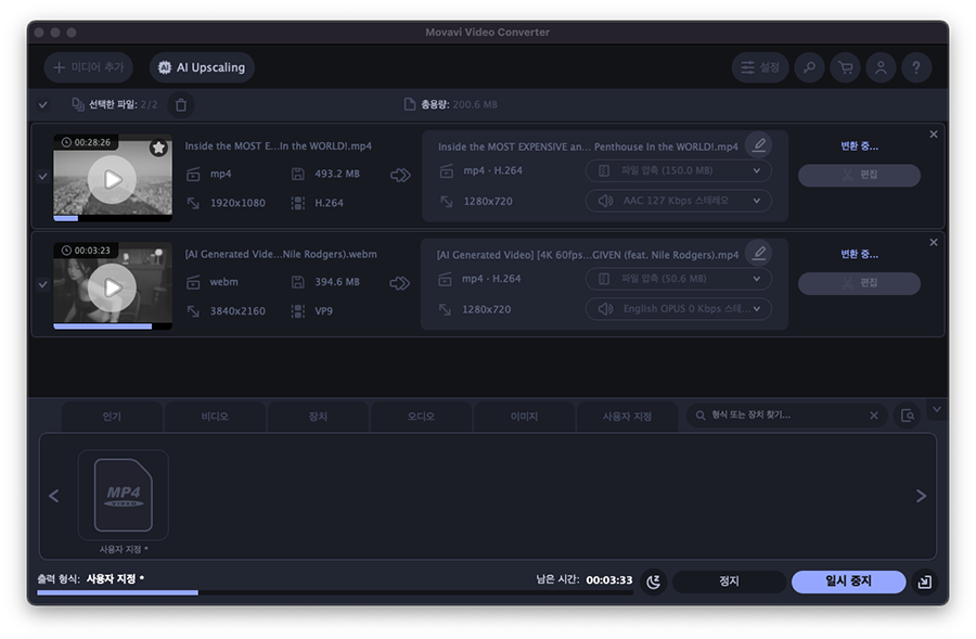 ๊ฐ์ฅ ๋จผ์ ์ถ์ฒํ๋ ๋์์ ๋ณํ ์ํํธ์จ์ด๋ Movavi Video Converter 2023์ ๋๋ค. MP4 ์์ ๋ฟ๋ง ์๋๋ผ MKV, WEBM ๋ฑ ๋์์ ํฌ๋งท์ ๋ณํํ๊ฑฐ๋ ๋น ๋ฅด๊ฒ ์์ถํด์ผ ํ ๋ ์์ ๋ถํฐ ์ ์ฉํ๊ณ ์๋ ์ํํธ์จ์ด์ธ๋ฐ์.