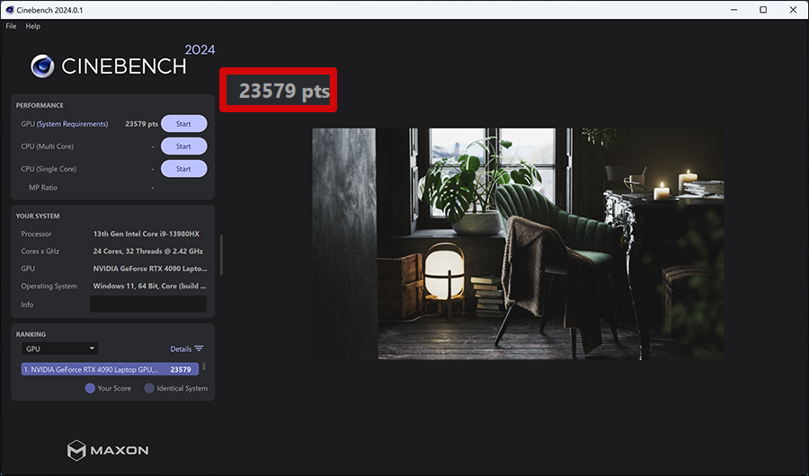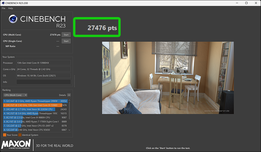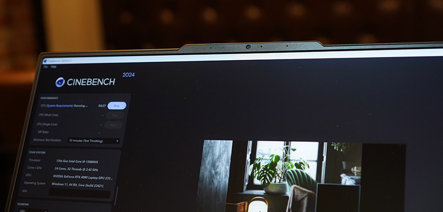 씨네벤치 R23의 결과는 27476점이네요. 이렇게 높은 점수를 보는 것이 실감이 잘 안납니다. 가장 마지막에 리뷰했던 AMD 게이밍 노트북이 AMD Ryzen Zen4 R7-7840HS 프로세서를 쓰고 있었는데, 거의 1만점이나 차이가 나네요.