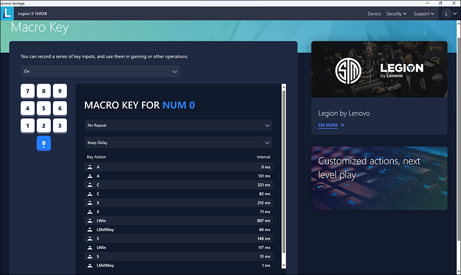 위와 같이 넘버키패드를 매크로 키로 프로그램밍하는 것도 가능합니다. 매크로를 잘 사용하시는 분들이라면 별도의 소프트웨어 없이 자체 관리 툴에서 지원을 해주고 있으니 잘 활용해봄직 합니다