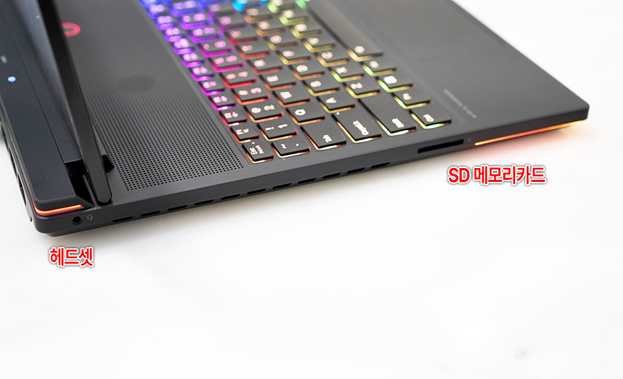 이 노트북이 가장 먼저 눈길을 끄는 이유는 압도적인 고성능 스펙이라는 것도 있지만, 외관에서 남다른 시도와 특별함을 주었다는 것을 먼저 짚어볼 수 있는데요. 바로 멀리서도 눈에 띄는 커버 디자인과 컬러 라이팅입니다.